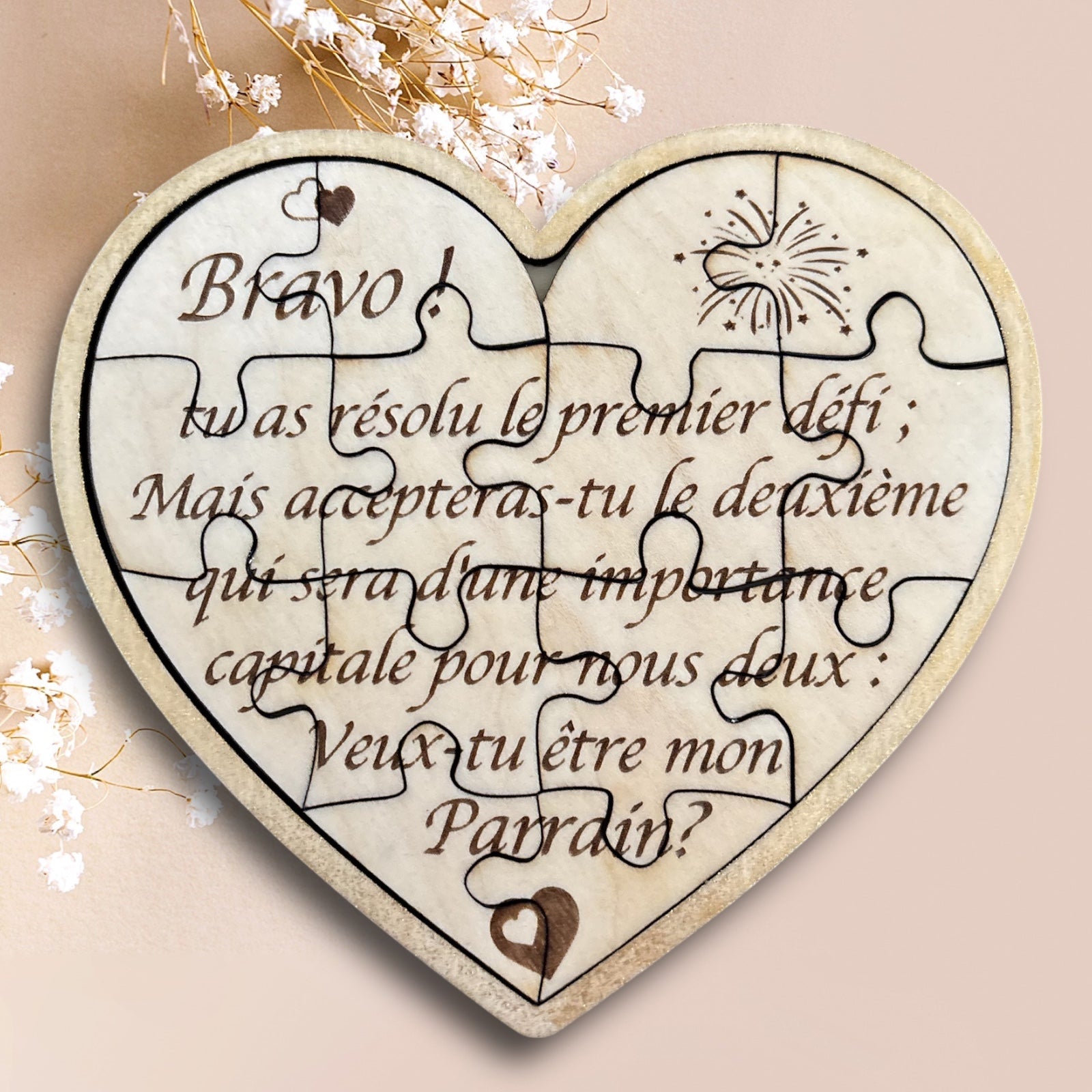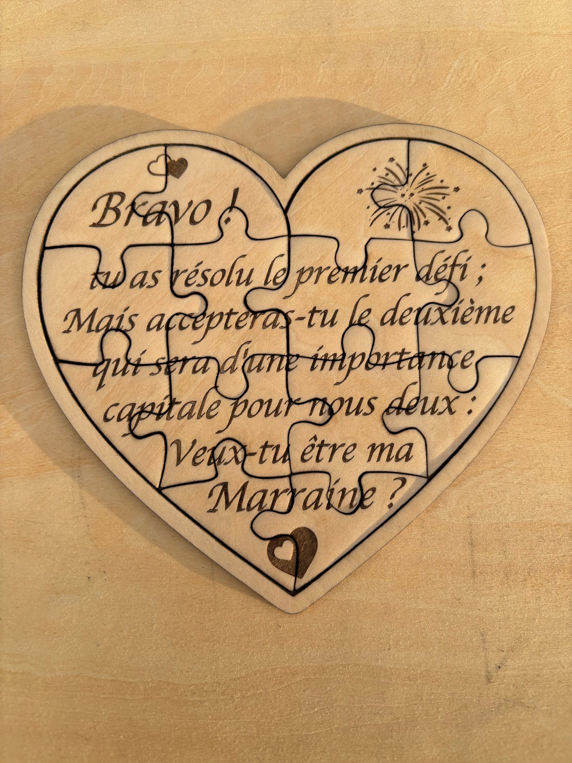 Faire-part puzzle CŒUR en bois Parrain / Marraine